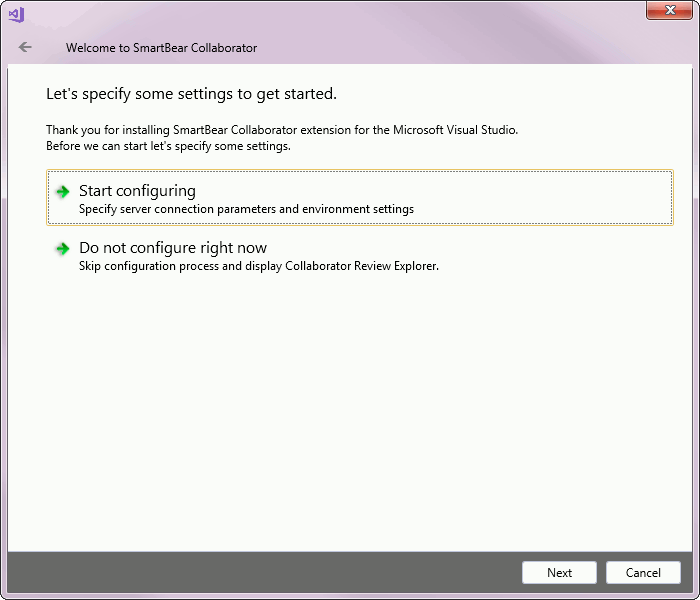When you open the Collaborator View window and the extension is not configured yet, it will invoke a Getting Started wizard suggesting to configure connection to Collaborator server and environment settings.