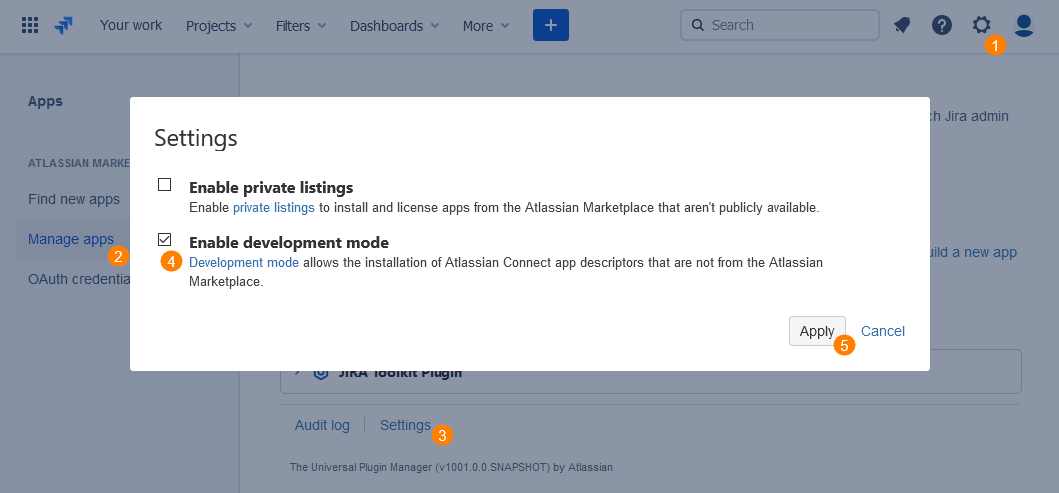 - In the following dialog, turn on the Enable development mode option and click Apply.
