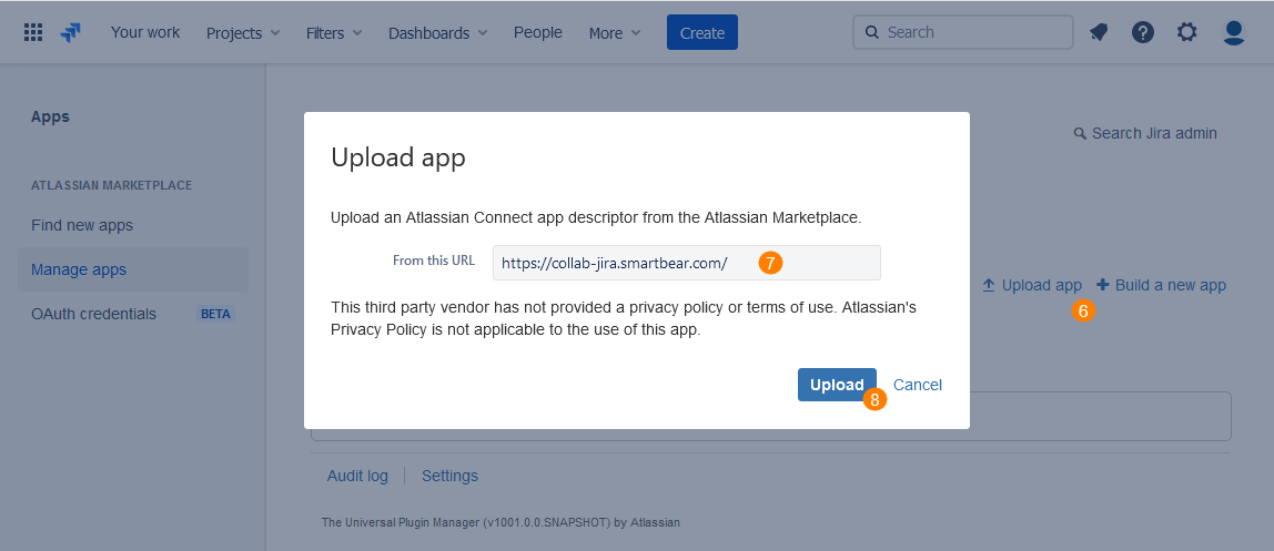 Once installed, the plug-in on will appear on the Manage apps page of the JIRA administration console.