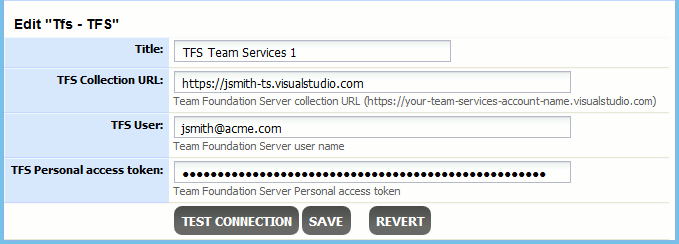 The specified user must have read-write permissions to TFS projects. Administrator permissions are NOT required. You may specify a regular user, or create a dedicated user for this integration.