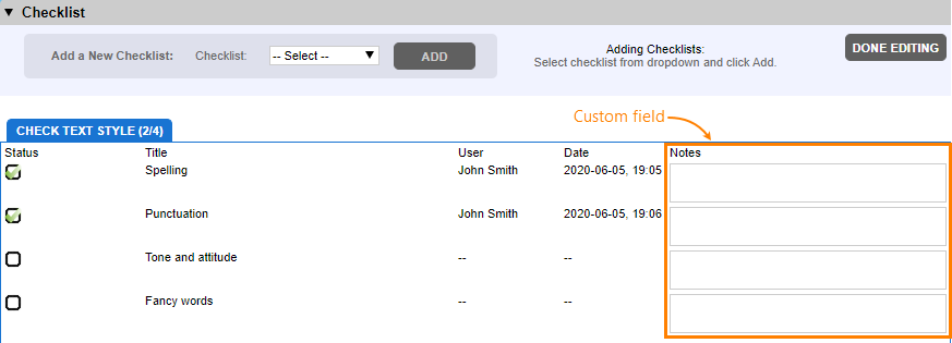 • Checklists can also use custom fields of the Checklist type. These fields are added as a column to every list item: