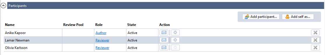 Unless the review is in the Planning stage, the Participants section will be in read-only mode. To add or remove participants or change their roles, click the Edit button. The Participants section will look like this: