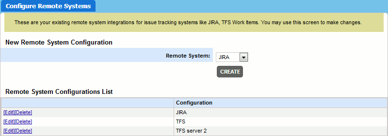On the Configure Remote Systems tab, you can create new configurations and edit your existing integration configurations. You can have multiple configurations for multiple issue-tracking services.