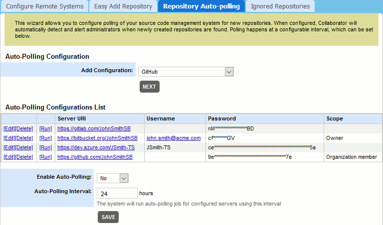 Alternatively, you may configure Collaborator server to automatically check if any new repositories were found on the specified remote hosting servers and notify administrators suggesting to create integrations with these newly created repositories. This can be performed on the Repository Auto-Polling tab.