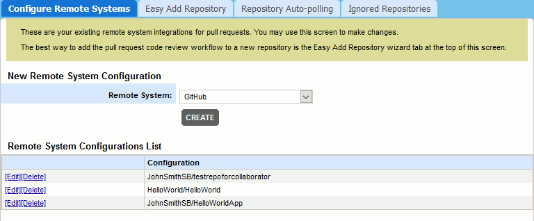 On the Configure Remote Systems tab, you can edit your existing integrations. You can have multiple configurations for remote repository services.
