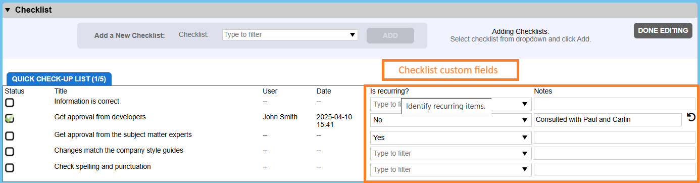 Checklist custom fields allow to specify and view any arbitrary information for checklist items. Upon mouse hovering over the checklist custom field, its description will be displayed , providing clarity on its purpose.