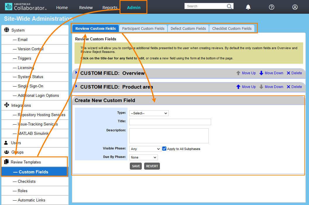 Custom fields allow adding arbitrary information fields to reviews. They help to fit Collaborator reviews into your workflow. Currently Collaborator supports custom fields for the following areas: reviews, defects, checklists and participants.