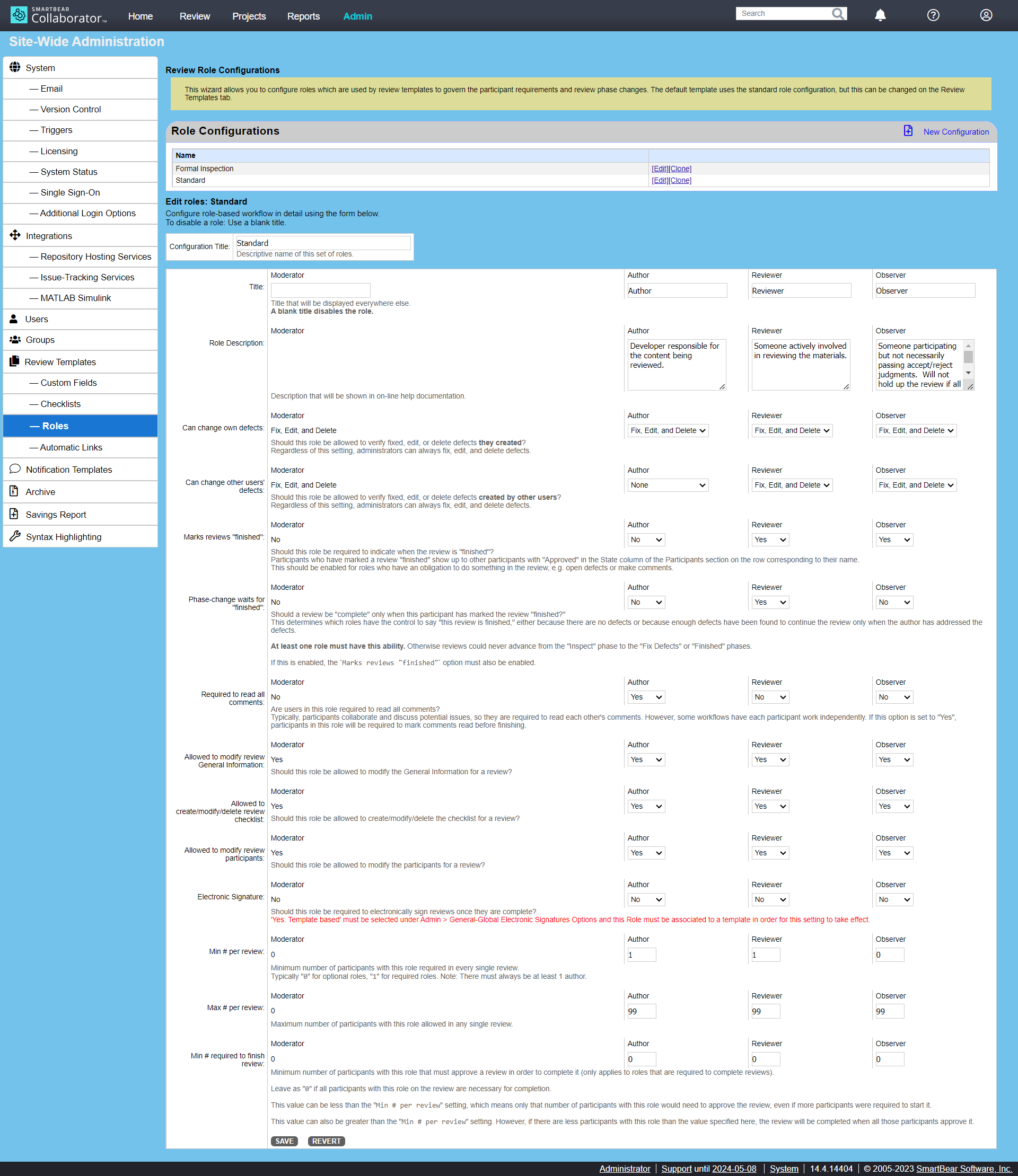 By default, Collaborator has two predefined role configurations: Standard and Formal Inspection. You can see them on the Roles screen: