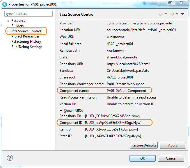 • In the subsequent Properties dialog, select Jazz Source Control from the tree on the left. Find the parameter values on the right: