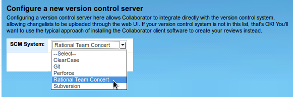 In addition to configuring the Collaborator server, you also need to install and configure special plug-ins for Rational Team Concert. For complete information on this, see topics of the Configuring Servers and Plug-Ins section.