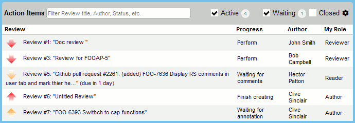Additionally, you can sort action items by clicking on the column headers: Review, Progress, Author, My Role and so on.