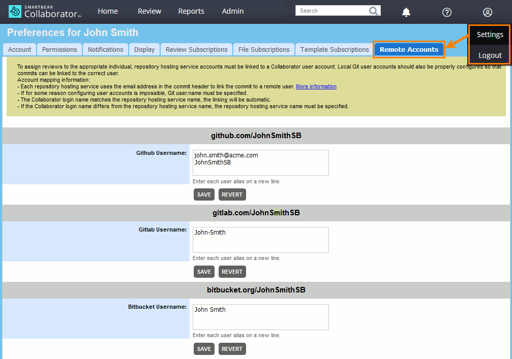 Remote Accounts allow you to specify correspondence between your user name or email address in Collaborator and your accounts in various remote servers. These settings are used to match user names for Collaborator integrations with remote servers. See Link User Accounts.