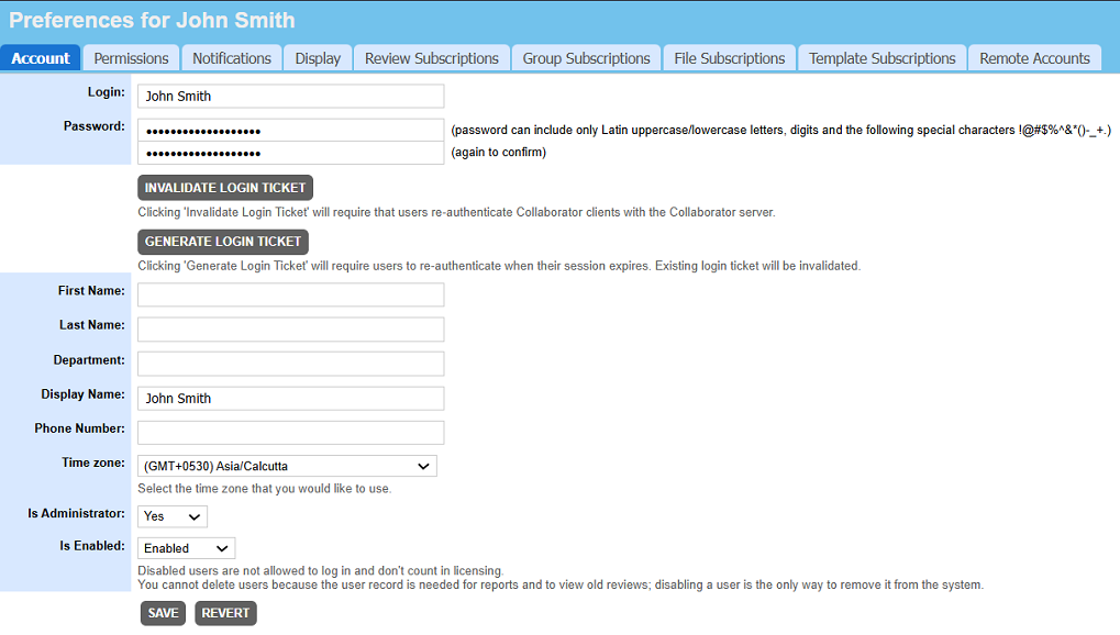 The password needed to log into the system. Can be blank for "no password," although in all cases the password will be displayed with many dots as shown in the screenshot above. This prevents the causal observer from knowing anything about your password, even its length. Password can include only Latin uppercase/lowercase letters, digits and the following special characters !@#$%^&*()-_+. When changing your password you have to type it in twice to confirm. Instead of using password, you can use login ticket for authentication in Collaborator desktop clients. Login tickets are special alpha-numeric identifiers that act as user credentials for a limited time period. By default, tickets are valid for 30 days. Collaborator administrators can decrease or increase ticket's time-to-live. To obtain a ticket, press Generate Login Ticket and copy the resulting alpha-numeric identifier. Now you can specify it instead of password in Collaborator desktop clients. Generating new login ticket, invalidates any existing login tickets. To invalidate any existing login tickets, press Invalidate Login Ticket. This will cause Collaborator desktop clients to re-authenticate. |