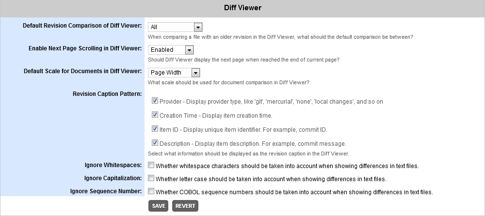 Allows the user to select which file revisions (if available) will be compared, by default, when the Diff Viewer is launched. The available options are: