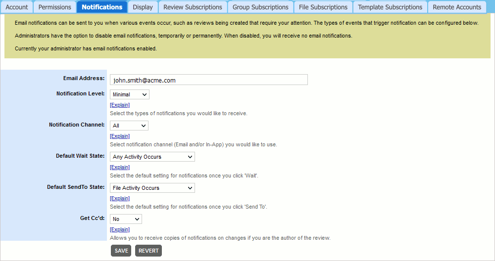 Template Subscriptions allow you to automatically subscribe and be included in reviews having a particular template. Select the name of a template you would like to subscribe to in the Review Template field and specify your desired role type (Reviewer, Observer, or Moderator) in the My Role field.