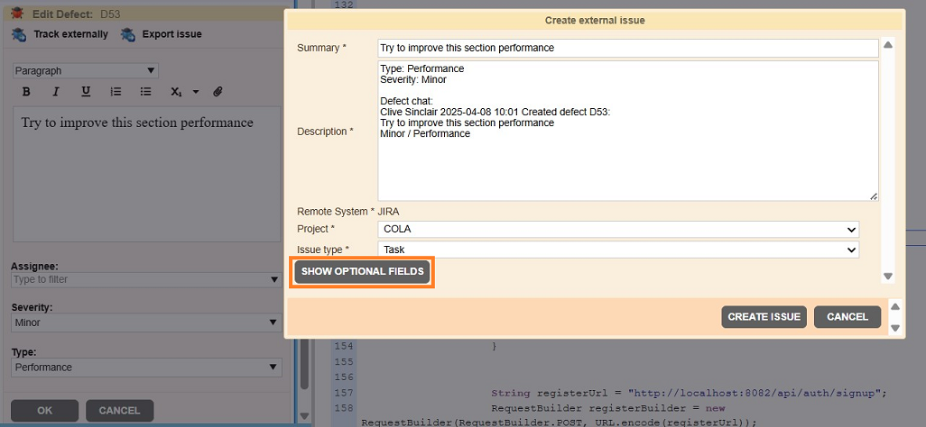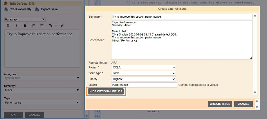 In the edit mode, you can change defect description and modify other defect custom fields. Also you can move the defect to external issue tracker (see next section for details on this). All of these activities will be logged into the chat conversation area as an audit trail of what happened.