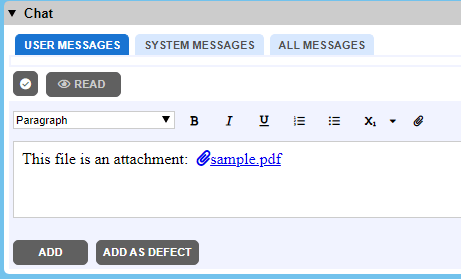 Once the defect is created, it is displayed in the Defect Log and Review Material sections of the Review Screen and in the Chat section of current file. The defect conversation is threaded. Open defects are denoted by red icon