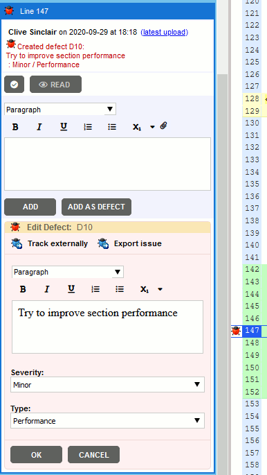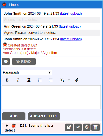 Review participants could convert only their own comments. Newly created defect is added to the end of conversation, with new date-time.