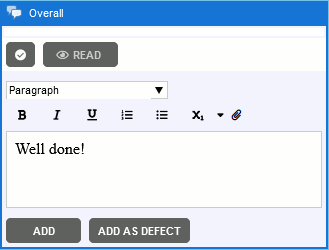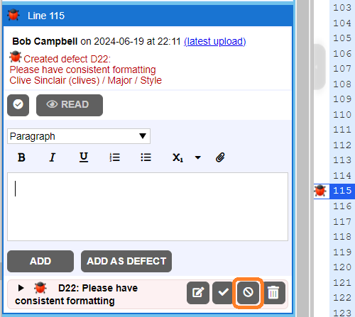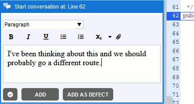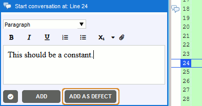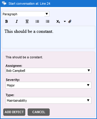 When you want to indicate that there is a problem that needs to be fixed rather than simply discussed you open a defect. Do this using the Add as defect button below the comment field: