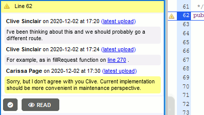 Notice that the conversation is now threaded by line 62 and that a chat icon (