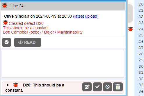 The word "defect" has many connotations that are inappropriate for peer review. This does not mean the problem will be mirrored in an external issue-tracking system, and it does not necessarily mean it was a bug! Even "bad documentation" can be a defect. A "defect" is just a way of identifying something that needs to be fixed. Moreover, if the word "defect" has a negative connotation in your environment, your Collaborator administrator can change it to another term. |