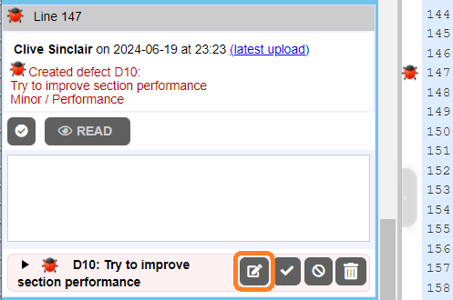 - Mouse-over the specific comment you would like to modify and click Convert to defect.