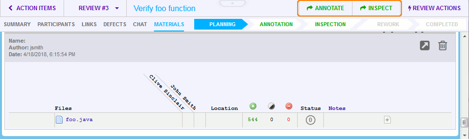 The Annotating phase is an optional phase that an author may select before the Inspection begins. It provides the opportunity for other participants to add comments, review materials or open defects prior to the Inspection phase. When a review is moved to Annotating, Collaborator will send notifications to all selected participants inviting them to participate in the review. Like Planning, Collaborator will not automatically move the review from the Annotating phase.