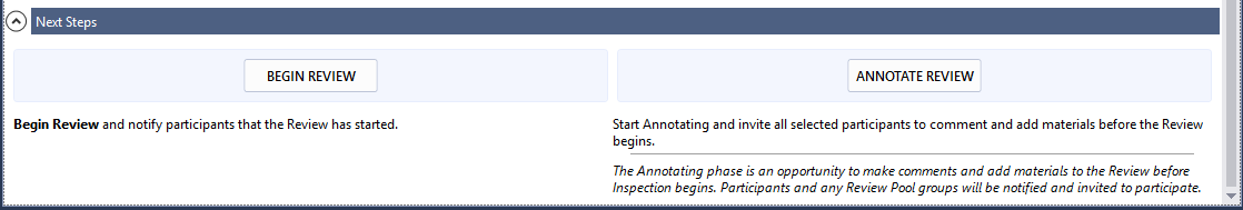 To move the review to the Annotating phase, click the Annotate Review button in the Next Steps section. To start the Inspection phase, click the Begin Review button.