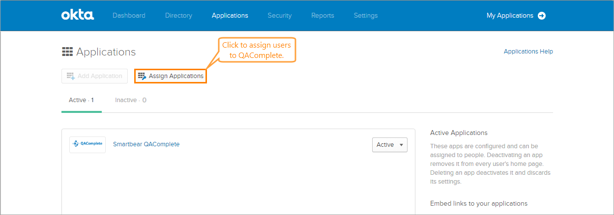 Before users from your organization can use Okta to log in to QAComplete, assign this application to them.