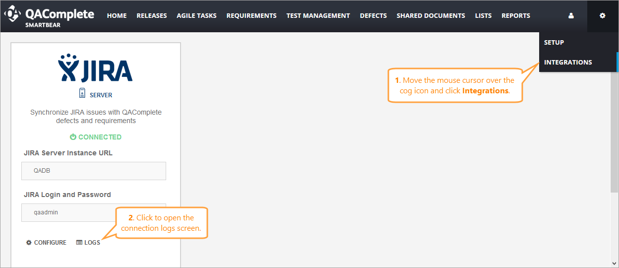 If you have connected QAComplete to your JIRA instance, the connection form that appears will show the