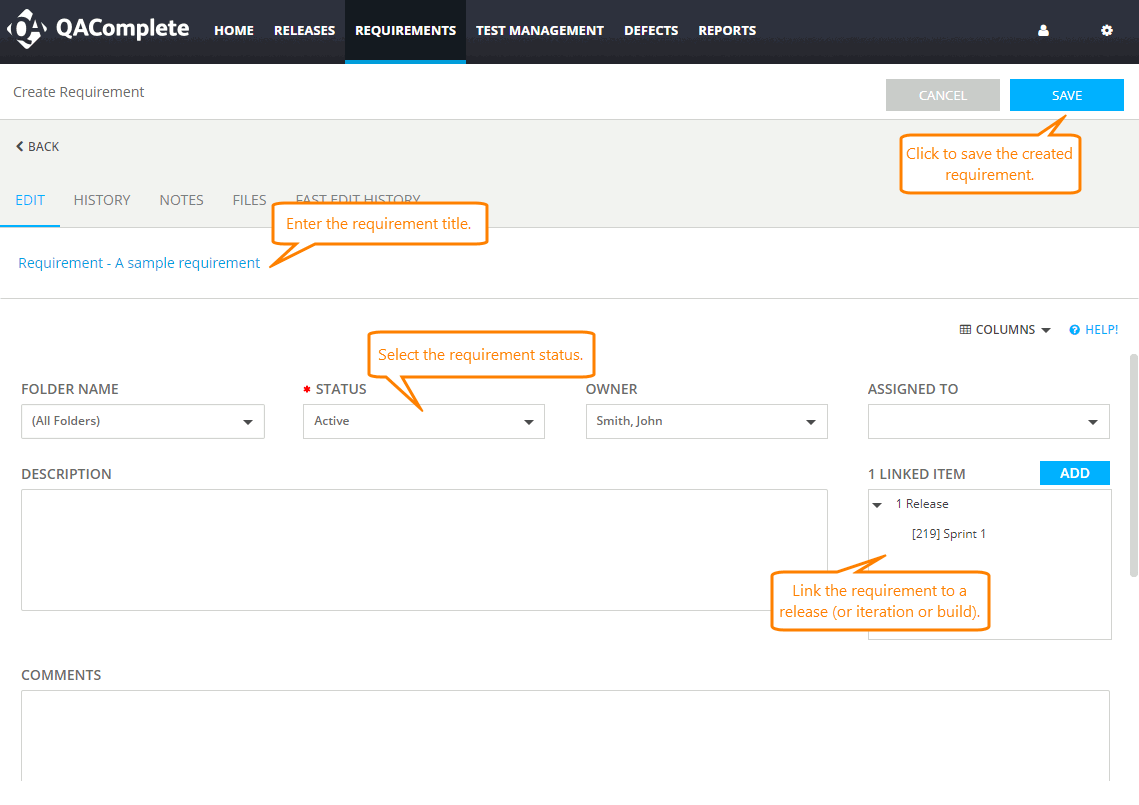 In QAComplete, you use requirements to track feature requests and enhancements in your project. You can document, estimate, and approve features, and link them to your release or sprint.
