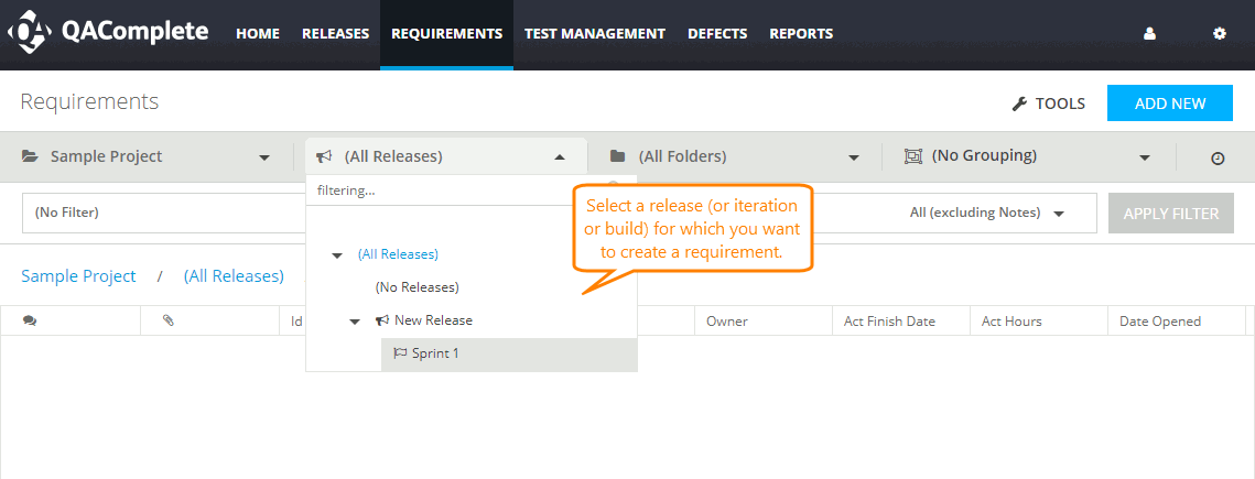 On the Requirements toolbar, select the release and the iteration to which you want to create a requirement: