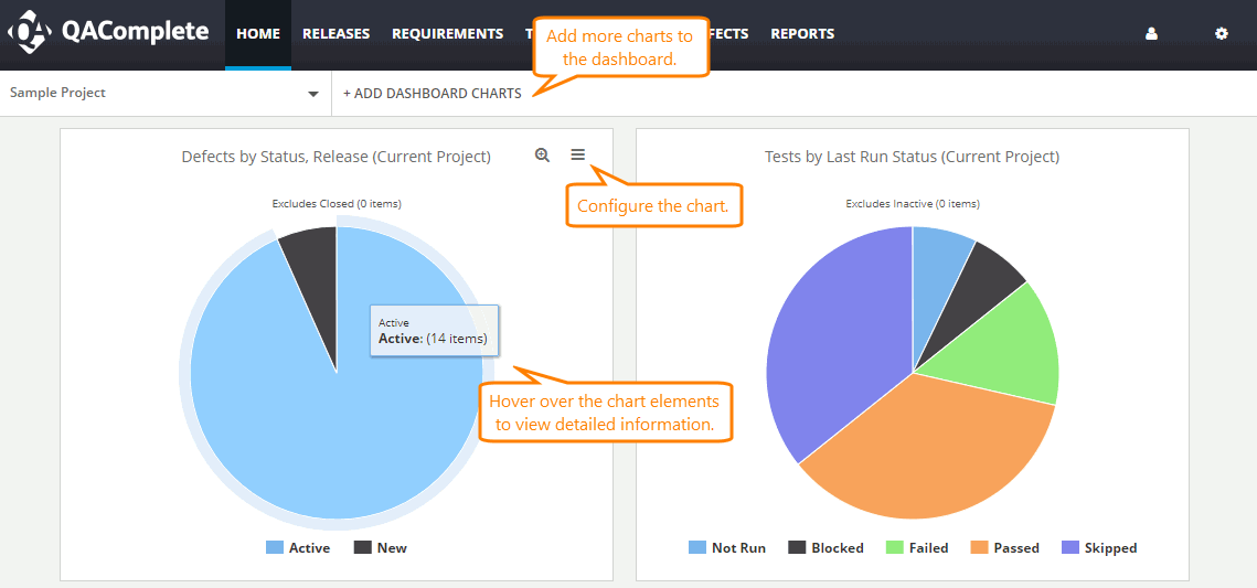 You can also use dashboard charts to get the graphical representation of your project’s current state. Go to Home > Dashboards to view the charts: