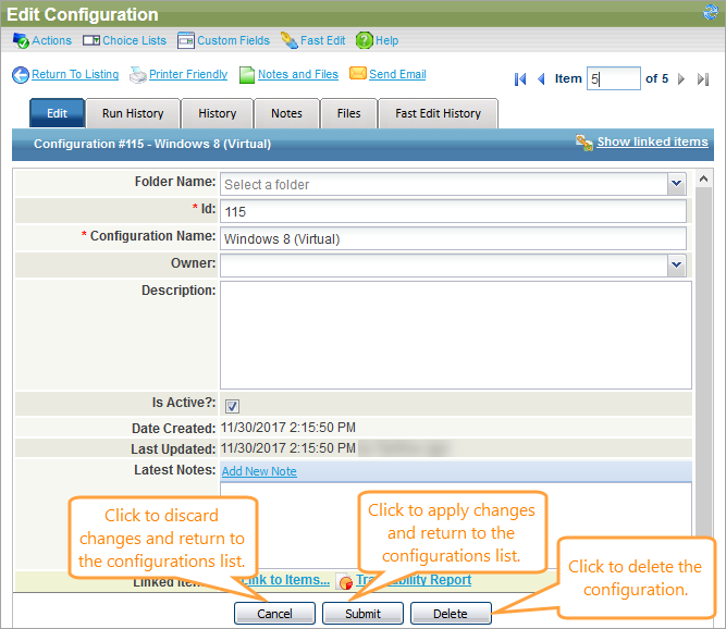 On the Edit Configuration form, you can apply the changes you need to the configuration: for example, edit the fields describing the configuration, make some comments, attach files, and so on. See below for more information.