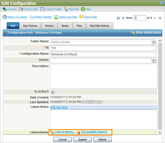 If you need to link some other items to the configuration (for example, a test or test set), use the Linked Items panel on the Add Configuration form or the Edit tab of the Edit Configuration form. See Linked Items for more information.