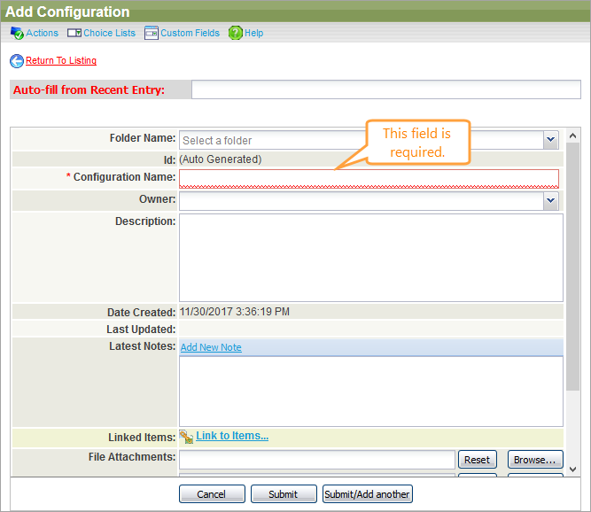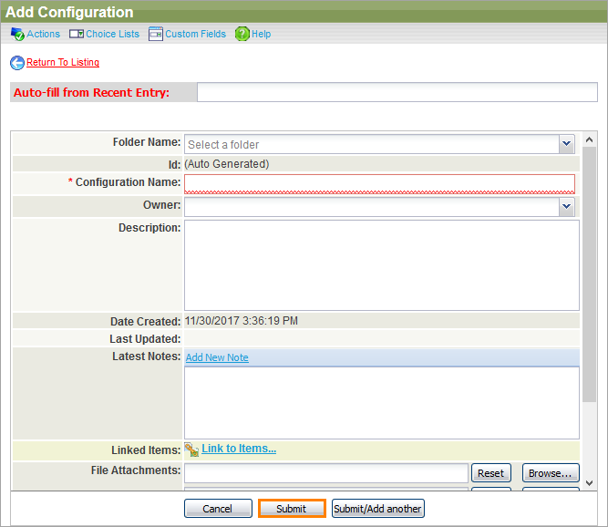 On the following Add Configuration form, provide the necessary information about a new configuration. You can use the auto-fill option to quickly describe the configuration – to do that, just select a recent entry in the Auto-fill from Recent Entry drop-down list.