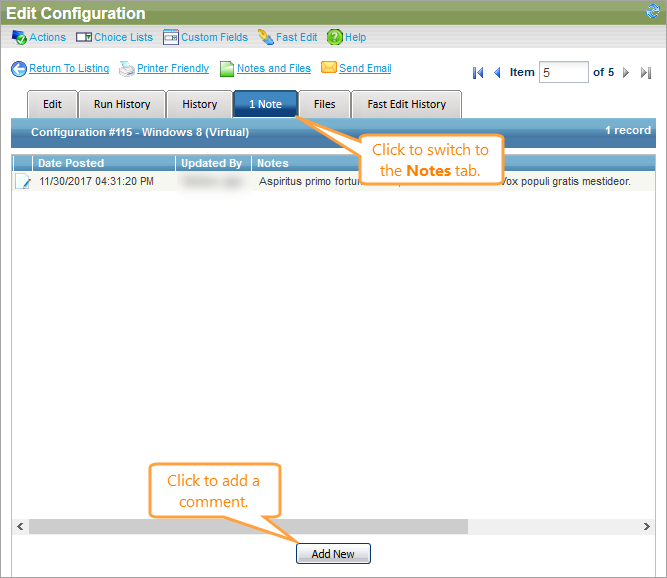 If you need to add some comments on the configuration, click Add New Note on the Add Configuration form or switch to the Notes tab on the Edit Configuration form and click Add New.