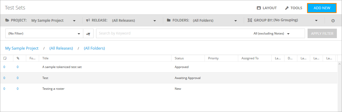 Once you created tests in the Test Library and prepared several configurations, you can build a test set. To do that, click Add New.