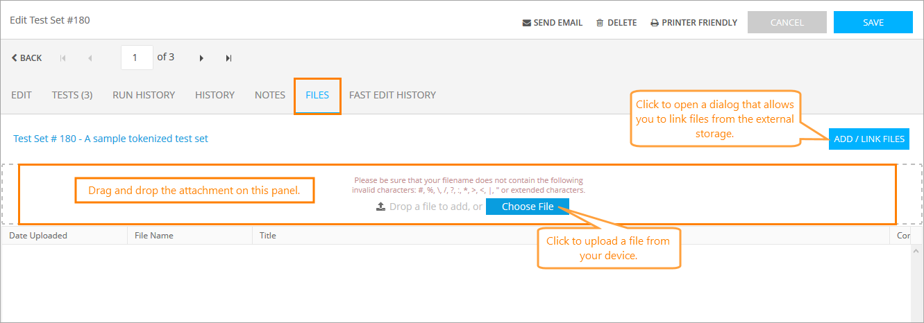 To attach files to the test set, switch to the Files tab on the Edit Test Set form, then drop the file to the panel. You can also click Choose File and upload a file from your device, or click Add / Link Files to open the Add New Link/Files dialog and upload the attachment from there.