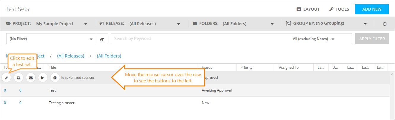In the set edit area, move the mouse cursor over the test’s row for the buttons to appear to the left. Use these to do one of the following: