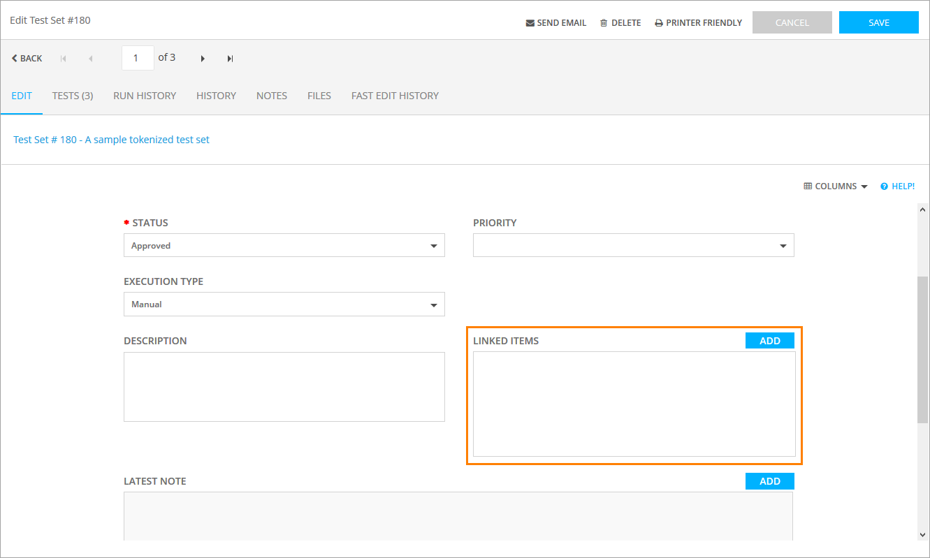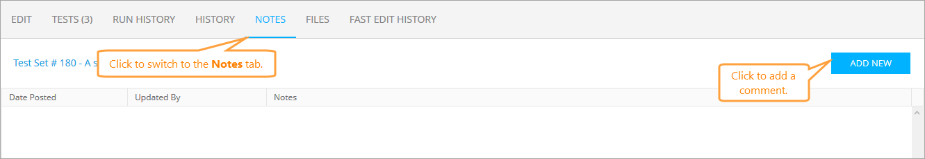 If you need to add some comments on the test set, switch to the Notes tab on the Edit Test Set form and click Add New.