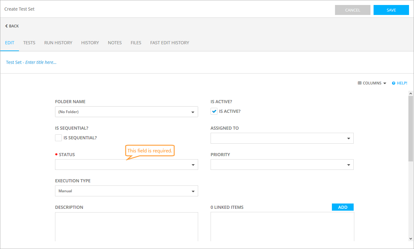 If you need to link some other items to the test set (for example, requirements or releases), use the Linked Items panel on the Edit tab of the Create Test Set or Edit Test Set form. See Linked Items for more information.