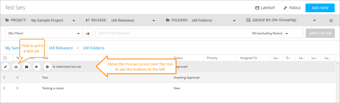 On the Test Sets screen, move the mouse cursor to the needed test set, then click the Printer Friendly that appears to the left.