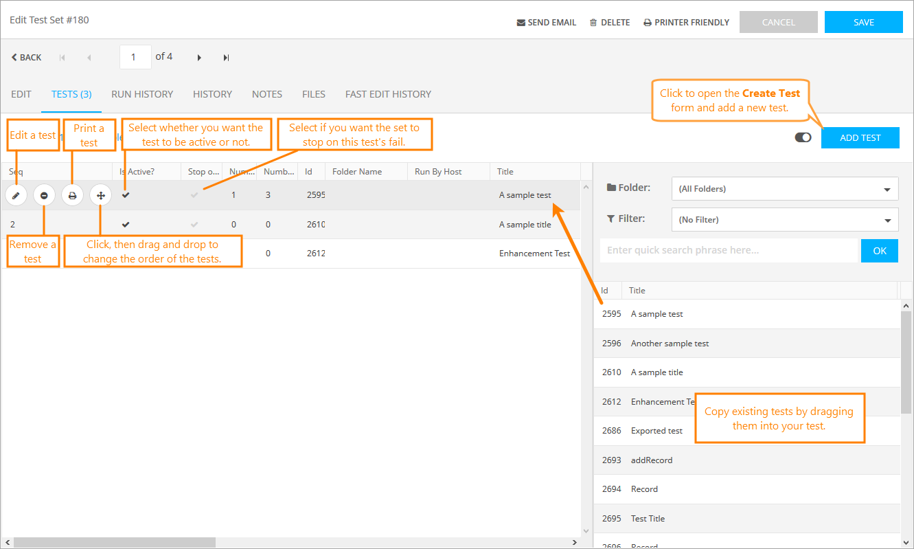 Click Delete Test to remove a test from the set.