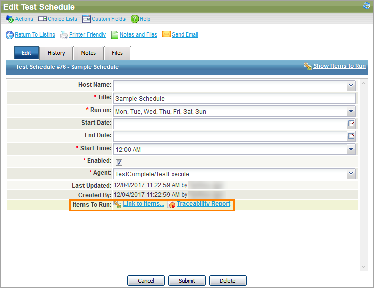 The Cancel, Submit, and Delete buttons on the Edit Test Schedule form
