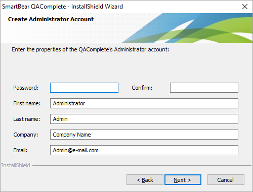 This account is your first QAComplete user and will automatically be a full system administrator. You will use this email and password to log in to QAComplete after the installation completes.