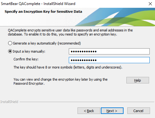If necessary, you can view and change the encryption key later by using the EncryptPersonsInfo utility. The utility is shipped with QAComplete. By default, it is installed to the following folder –
