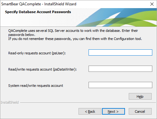 QAComplete uses three internal SQL Server accounts to perform queries of different types. Enter the passwords for these accounts: