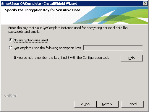 For security reasons, QAComplete can encrypt sensitive user data like passwords. This is an extra security means in addition to the SQL Server security. If your database was encrypted, specify the encryption key on this page: