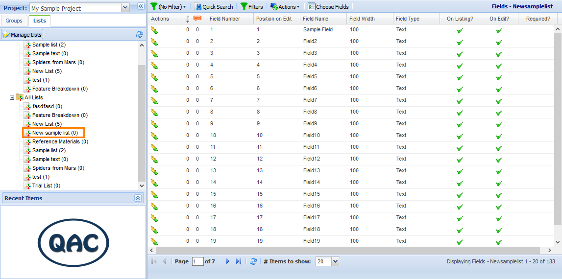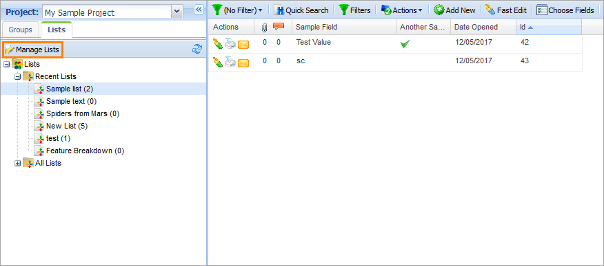 On the List Manager screen, click Manage Fields in the Actions column on the row of the needed list.